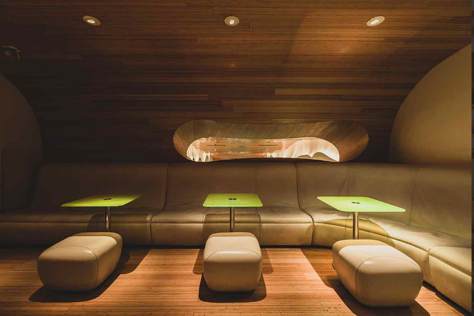 The lounge upstairs — where the projection room would be — is womb-like: low-ceilinged, paneled in bamboo, with low white pleather wrap-around couches and a itty-bitty bar tucked in the corner. An 8-foot wide blob-shaped hole in the wall let us look out over the whole dining room. In keeping with the screening room metaphor, Morimoto’s domain — the kitchen and sushi bar — is in the back of the restaurant, where the screen would be.