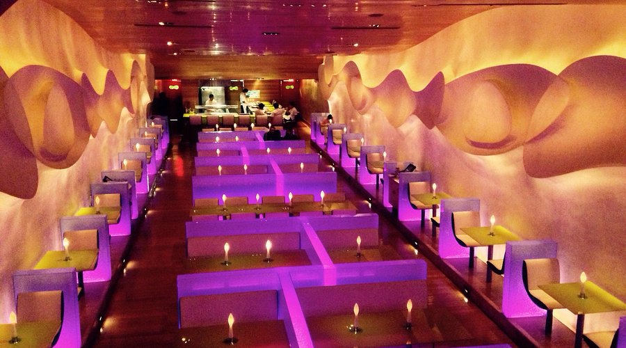 The restaurant has wide tables down the center seating eight, with rocket-age bench seats covered in the same white pleather as the lounge’s couches. Tempered glass walls separate the tables and are internally lit with continuously cycling color. The walls have large wavy organic-shaped sculpture picked out with halogen spotlights that dim and brighten, slowly changing the shadows and wall colors. The light lime green glass tabletops have built-in white lamps that seemed frighteningly phallic to us. The tables were set with thick mahogany chopsticks set on small river rocks. We would later discover that the downstairs bathroom continued the design trends with bamboo panels, flat black river rock floors and mysterious infrared hand dryers inset in the walls behind blob-shaped holes.